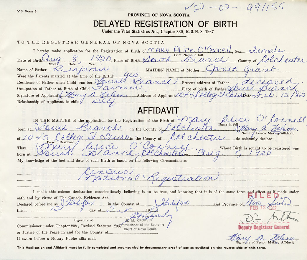 Signature of Applicant Mary A. Nelson Address of Applicant 1045 College Street, Truro, Colchester Co. Date 12 February 1982