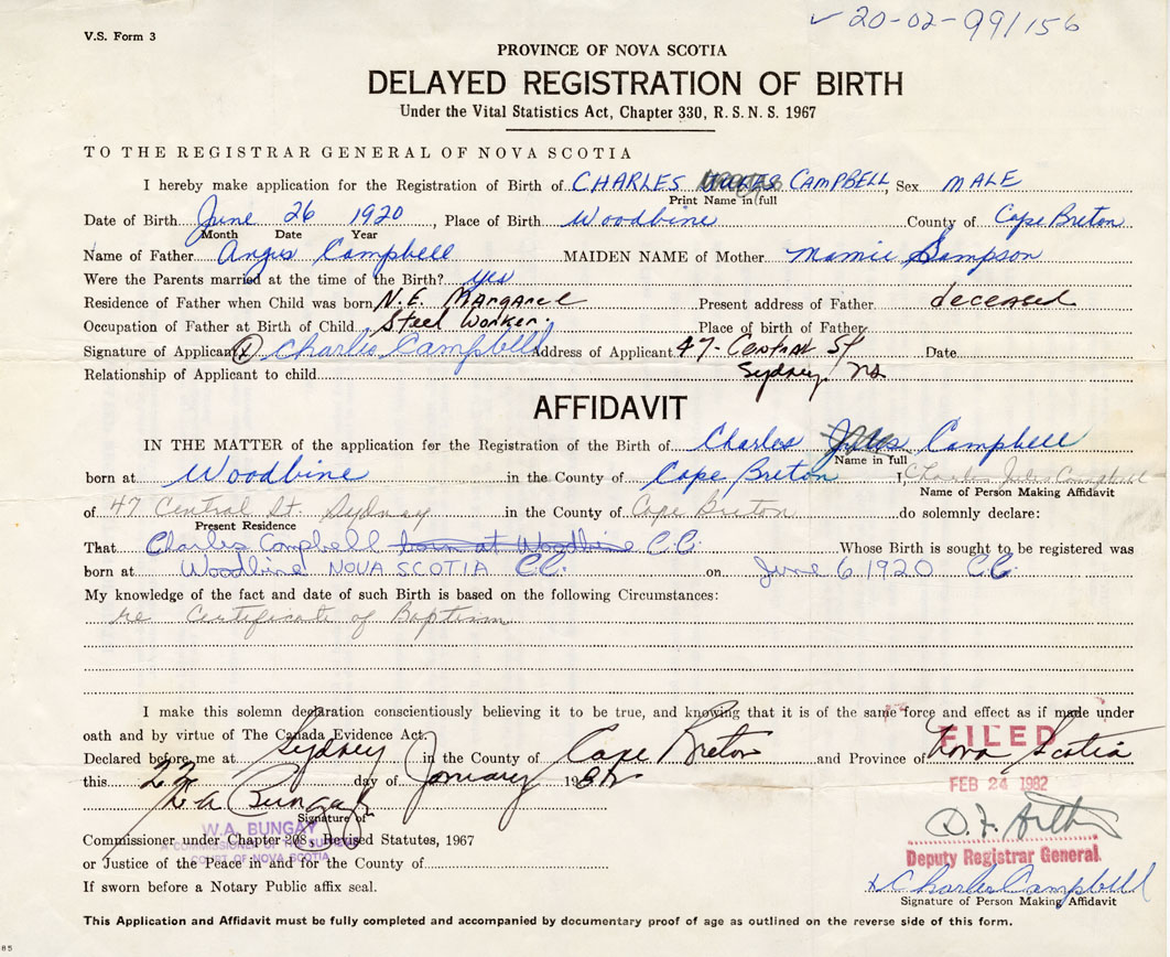 Date of Birth June 26, 1920 Place of Birth WoodbineCounty of Cape Breton