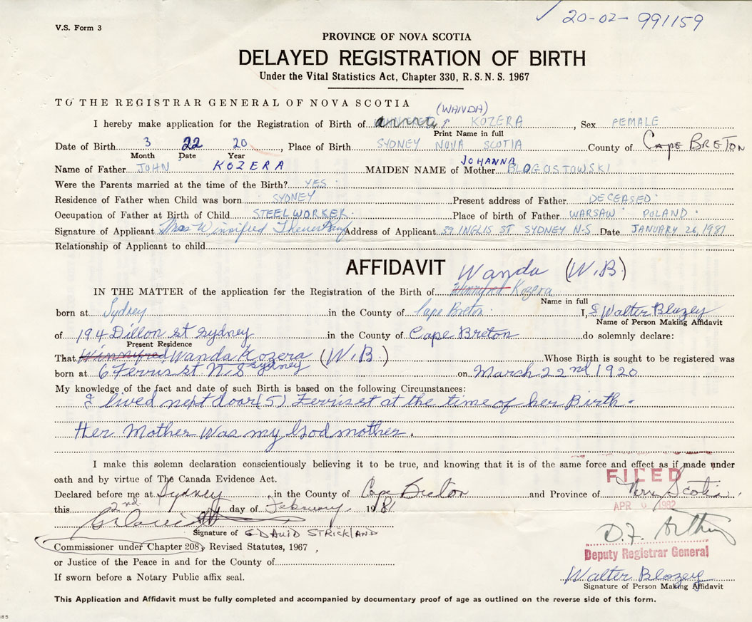 IN THE MATTER of the application for the Registration of the Birth of WandaKozera