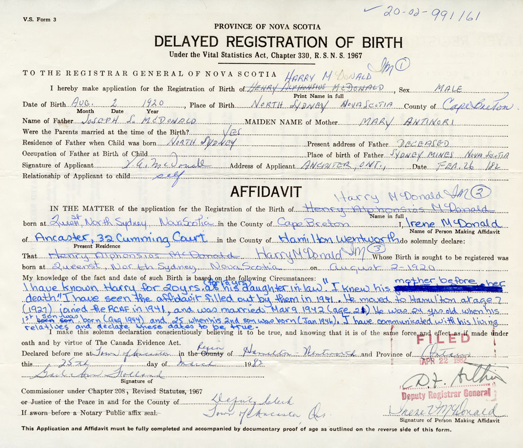I have known Harry for 20 years, for 13 years as his daughter-in-law. "I knew his mother before her death." I have seen the affidavit filled out by them in 1941. He moved to Hamilton at age 7 (1927), joined the RCAF in 1941, and was married March 9, 1942 (age 21). He was 24 years old when his 1st son was born (August 1944) and 25 when his 2nd son was born (January 1946). I have communicated with his living relatives and declare these dates to be true. - Irene McDonald