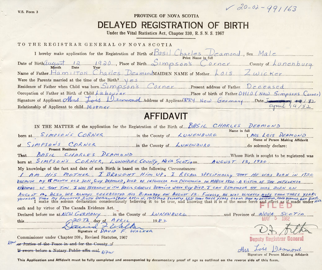 Date of Birth August 12, 1920 Place of Birth Simpsons CornerCounty of Lunenburg