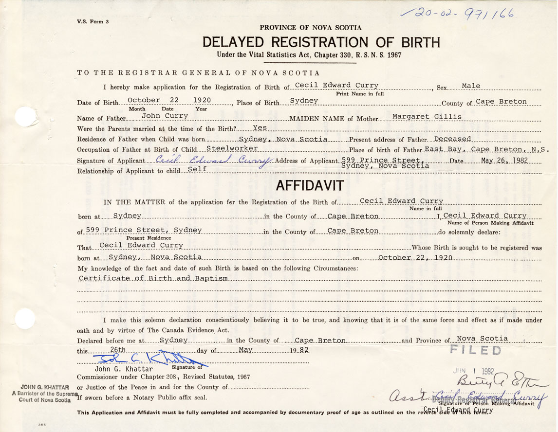 Date of Birth October 22, 1920 Place of Birth SydneyCounty of Cape Breton
