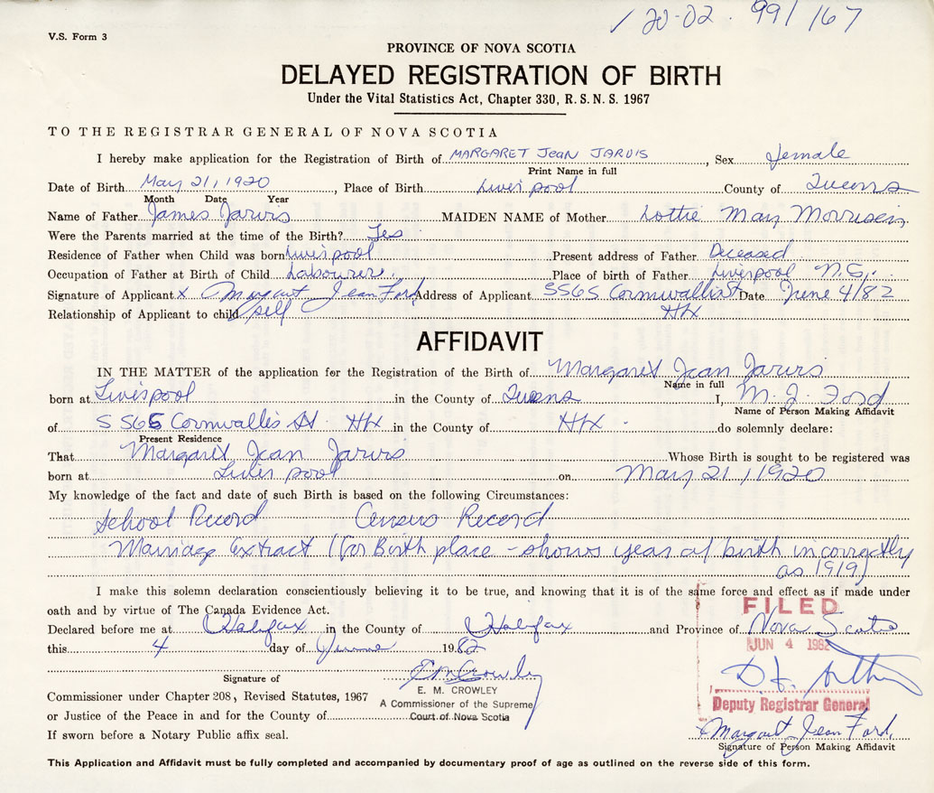 IN THE MATTER of the application for the Registration of the Birth of Margaret Joan Jarvis