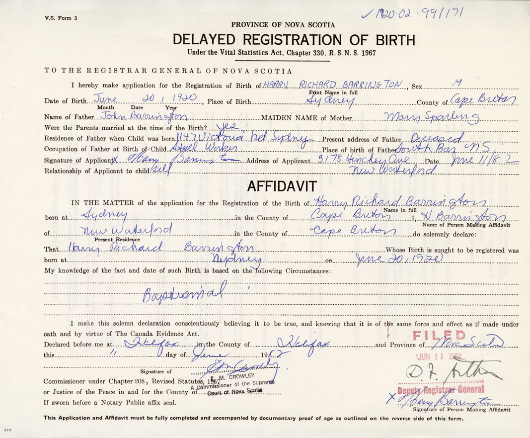 Signature of Applicant Harry Barrington Address of Applicant New Waterford Date June 11, 1982