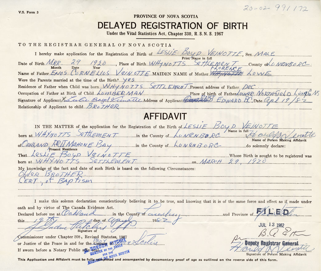 Date of Birth March 29, 1920 Place of Birth Whynotts SettlementCounty of Lunenburg