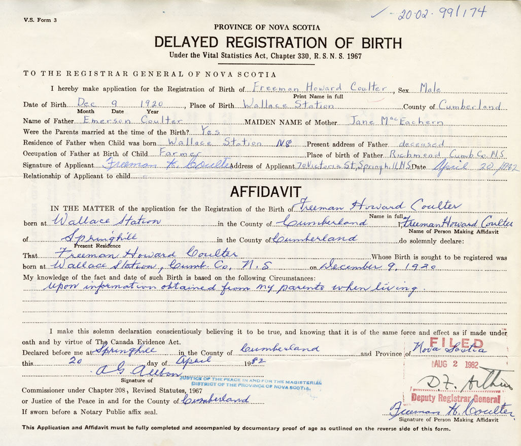 I hereby make application for the Registration of Birth of Freeman HowardCoulter Sex Male