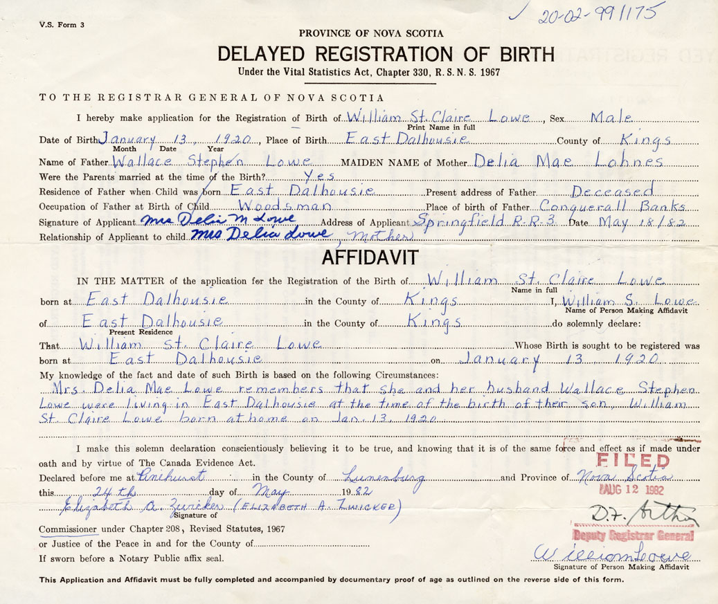 Mrs. Delia Mae Lowe remembers that she and her husband Wallace Stephen Lowe were living in East Dalhousie at the time of the birth of their son, William St. Clair Lowe born at home on January 13, 1920.