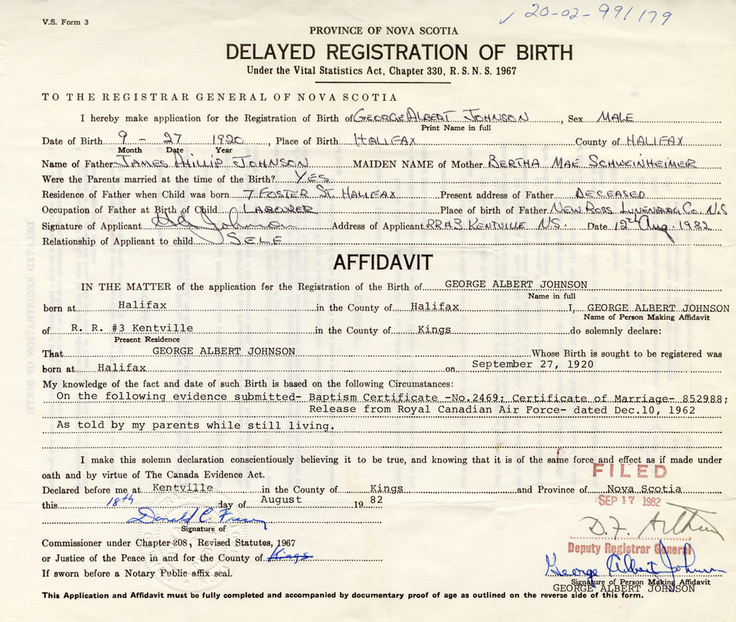 Signature of Applicant George Albert Johnson Address of Applicant Kentville Date August12, 1982