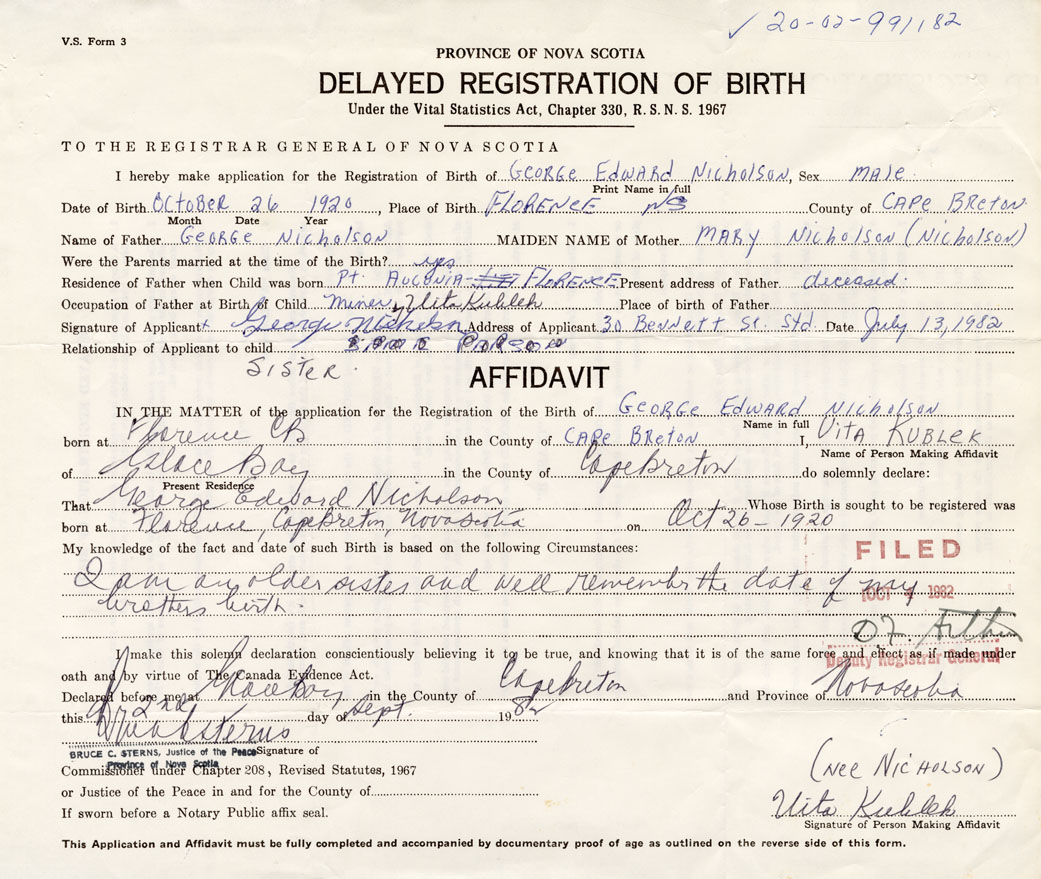Date of Birth October 26, 1920 Place of Birth FlorenceCounty of Cape Breton
