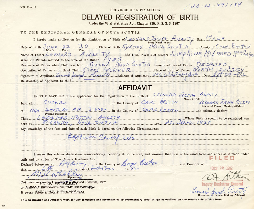 I hereby make application for the Registration of Birth of Leonard JosephAnesty Sex Male