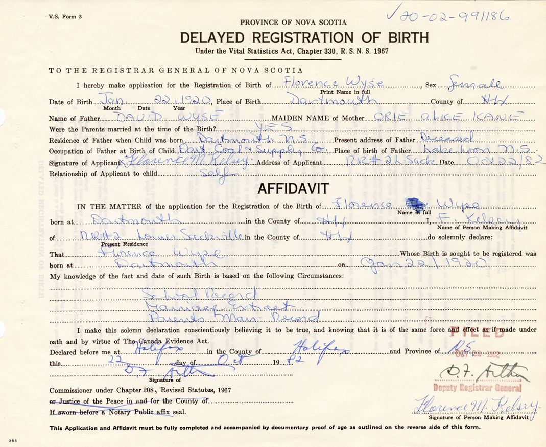 Signature of Applicant Florence Kelsey Address of Applicant Sackville Date October 22, 1982