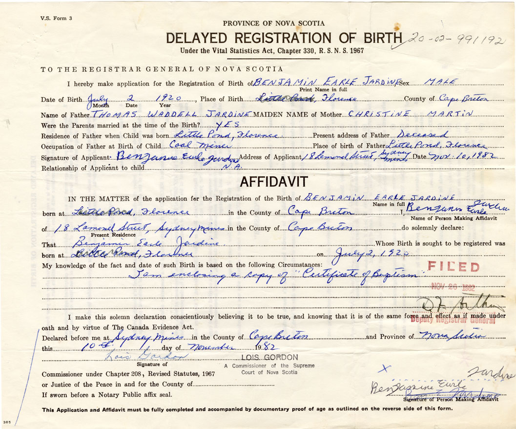 Signature of Applicant Benjamin Earle Jardine Address of Applicant Sydney Mines Date November 10, 1982