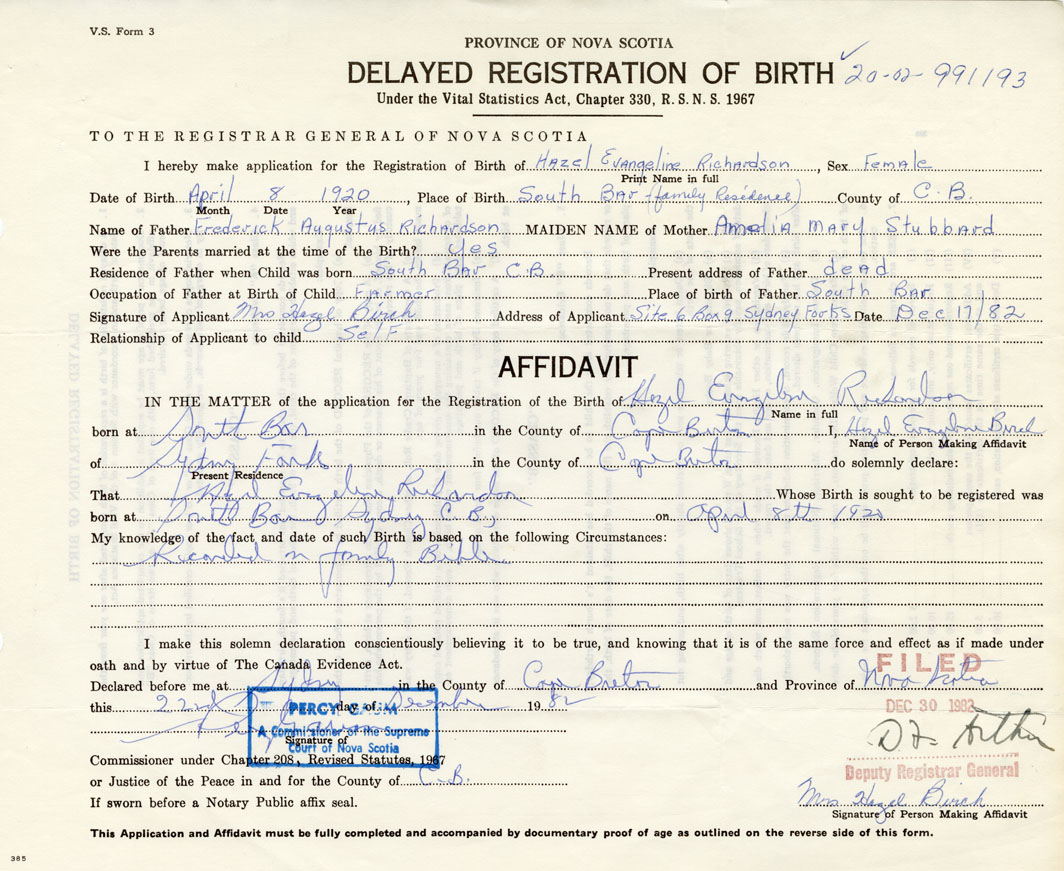 Signature of Applicant Hazel Birch Address of Applicant Sydney Forks Date December 17, 1982