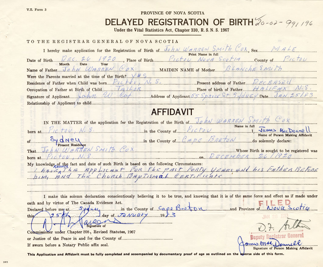 Date of Birth December 26, 1920 Place of Birth PictouCounty of Pictou
