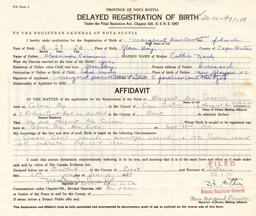 Date of Birth September 23, 1920 Place of Birth Glace BayCounty of Cape Breton