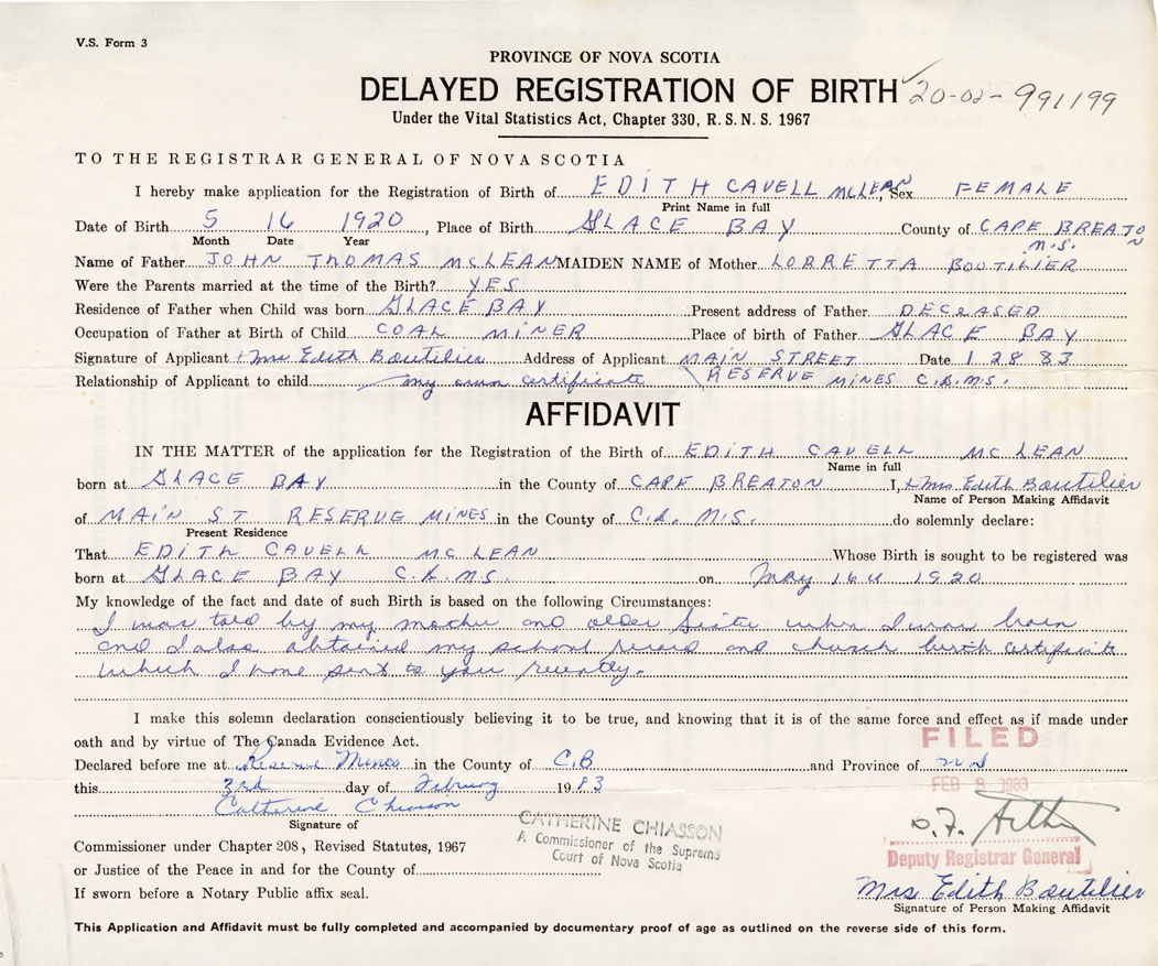 IN THE MATTER of the application for the Registration of the Birth of Edith CavellMcLean