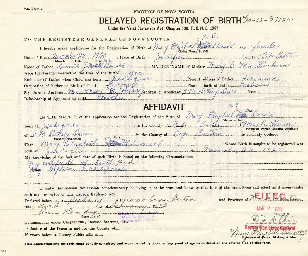 Date of Birth November 22, 1920 Place of Birth JudiqueCounty of Cape Breton