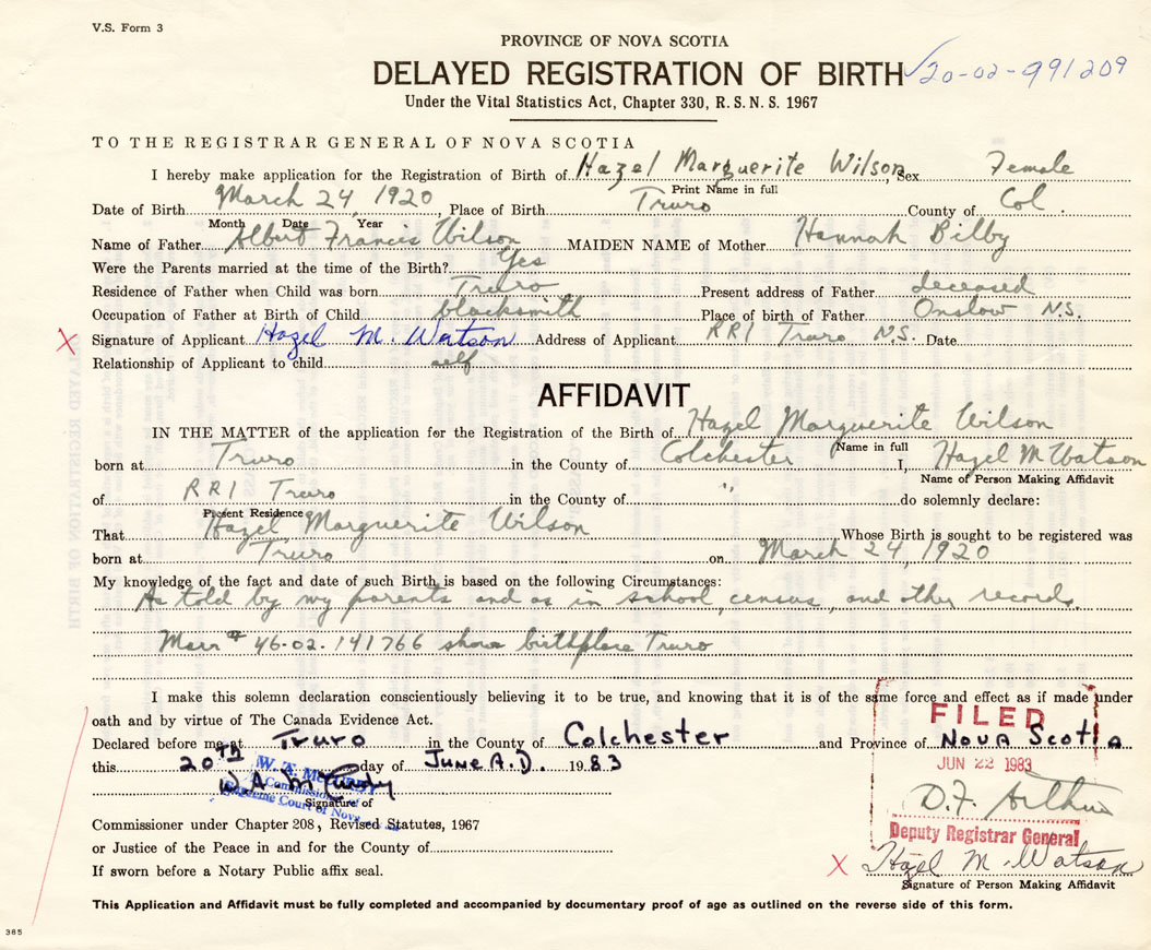 Signature of Applicant Hazel M. Watson Address of Applicant RR #1, Truro, Colchester Co. Date 20 June 1983