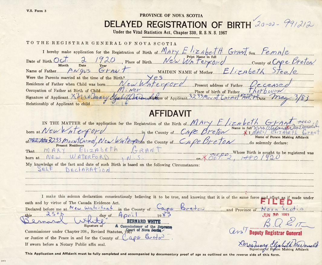 Date of Birth October 2, 1920 Place of Birth New WaterfordCounty of Cape Breton