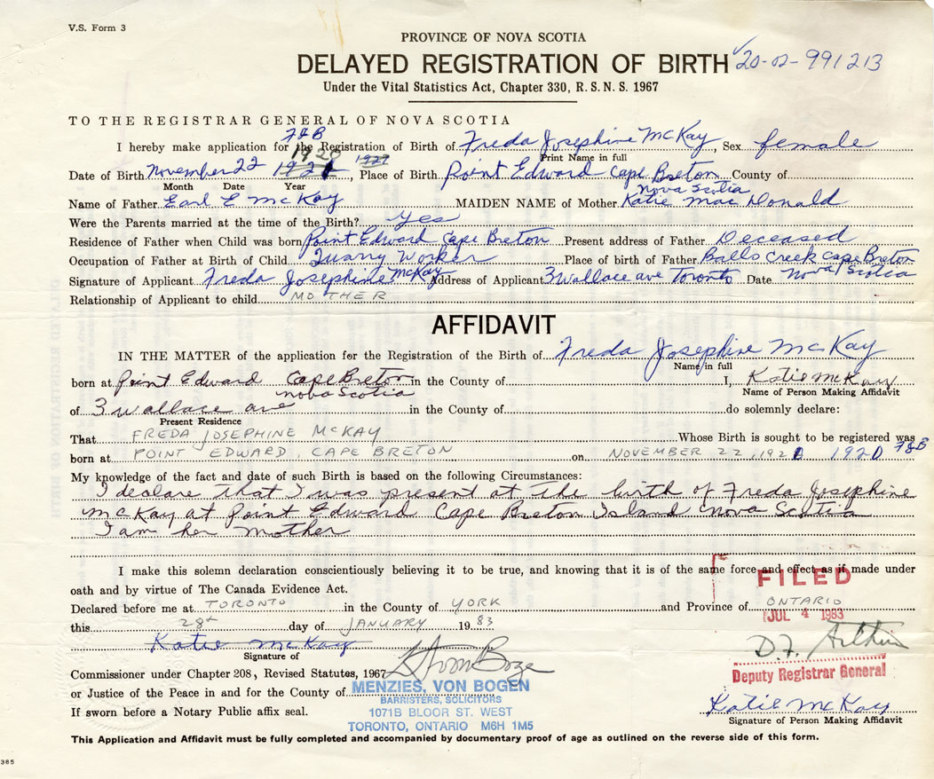 I declare that I was present at the birth of Freda Josephine McKay at Point Edward, Cape Breton Island. I am her mother.