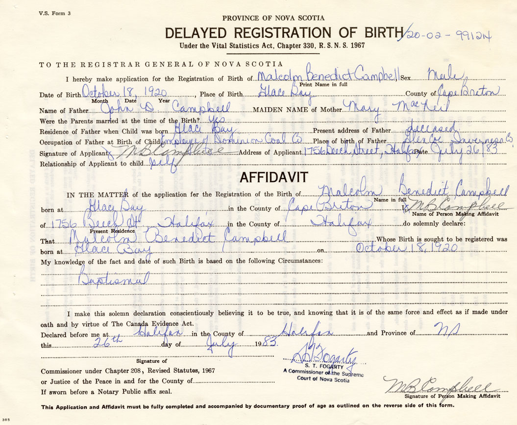 Signature of Applicant M.B. Campbell Address of Applicant 1756 Beech Street, Halifax, Date July 26, 1983