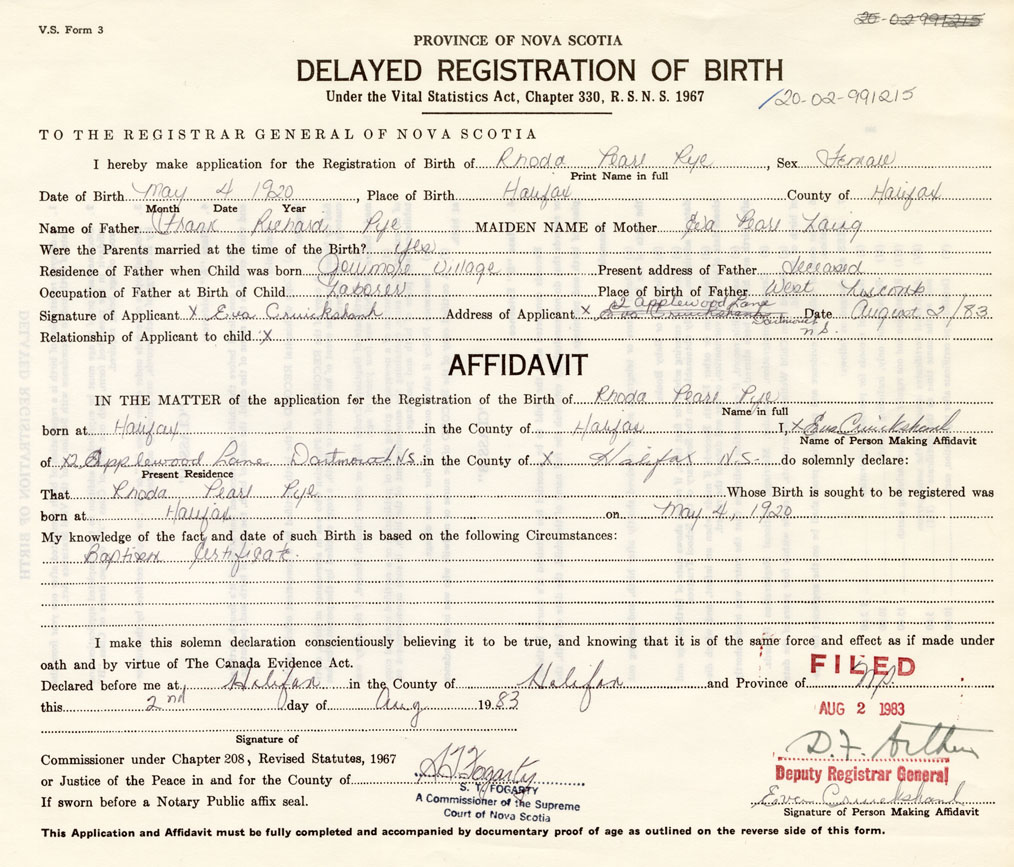 I hereby make application for the Registration of Birth of Rhoda PearlPye Sex