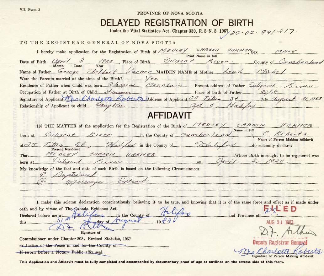 Date of Birth April 3, 1920 Place of Birth Diligent RiverCounty of Cumberland