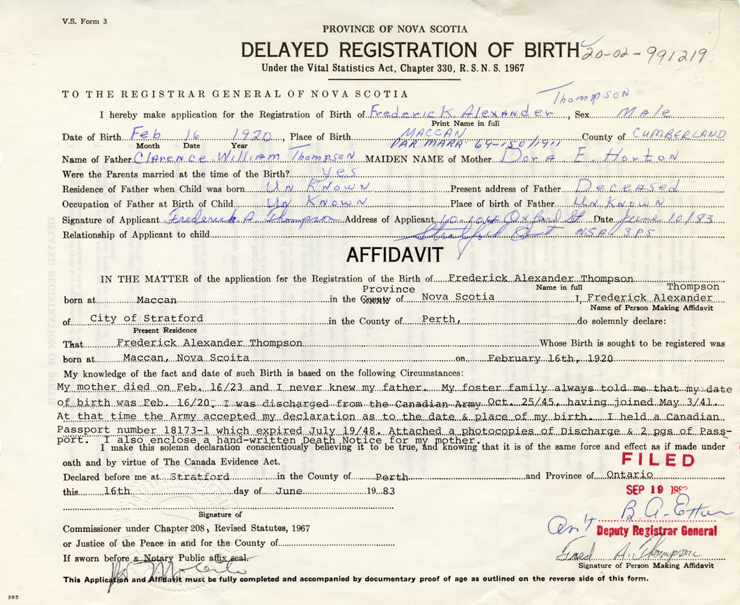 My mother died on February 16, 1923 adn I never knew my father. My foster family always told me that my date of birth was February 16, 1920. I was discharged from the Canadian Army October 25, 1945, having joined May 3, 1941. At that time the Army accepted my declaration as to the date and place of my birth. I held a Canadian Passport number 18173-1 which expired July 19, 1948. Attached a photocopy of Discharge & 2 pages of Passport. I also enclose a hand-written death notice for my mother.