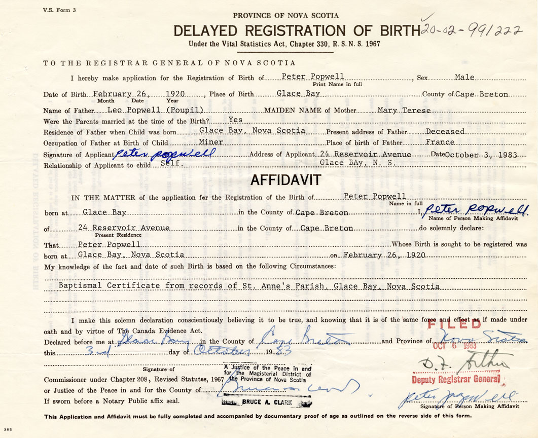 Signature of Applicant Peter Popwell Address of Applicant 24 Reservoir Avenue, Glace Bay, Cape Breton Co. Date 3 October 1983