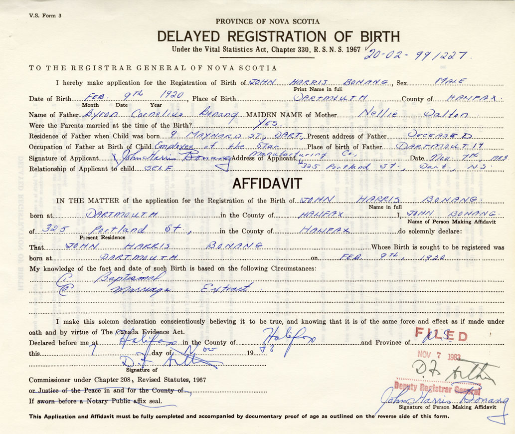 Signature of Applicant John Harris Bonang Address of Applicant 325 Portland Street, Dartmouth Date 7 November 1983