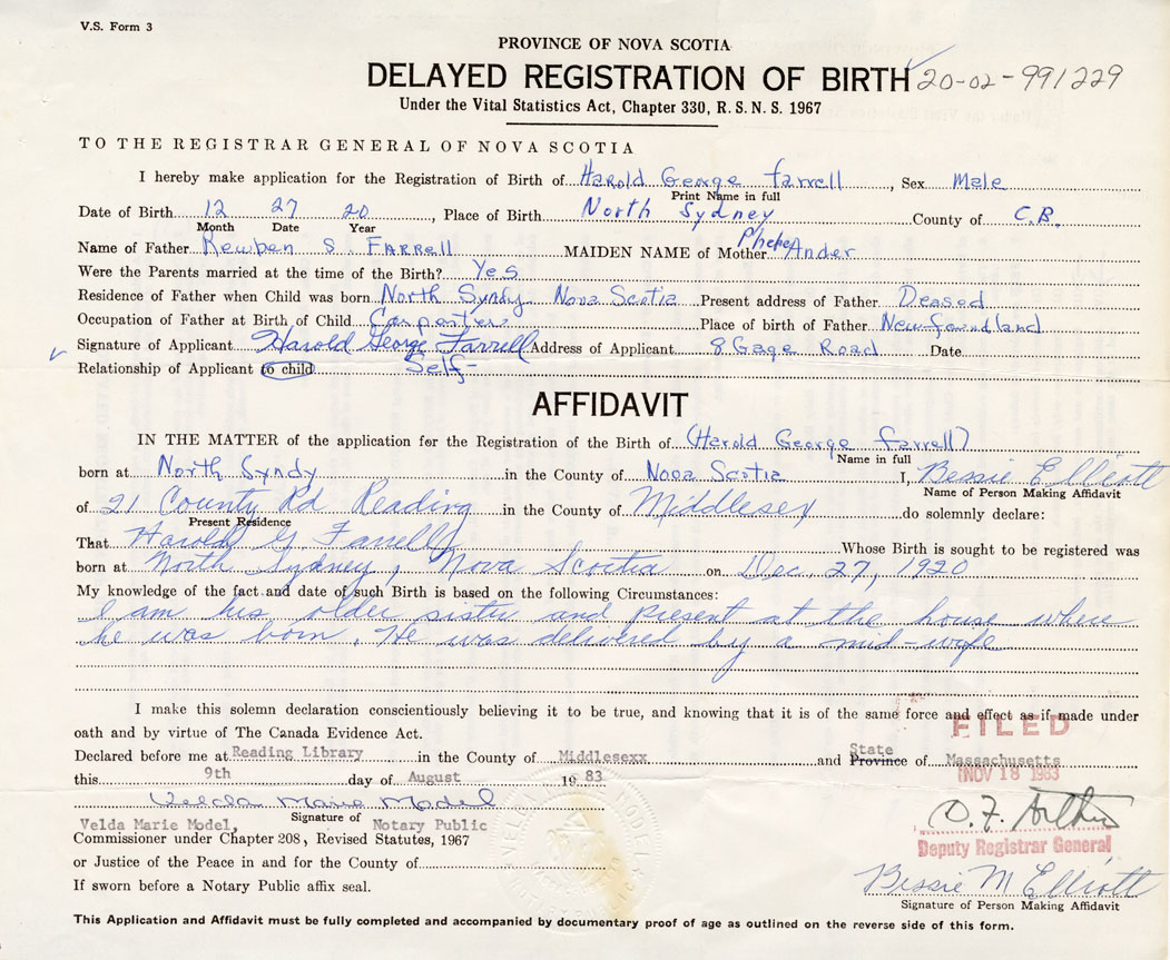 I hereby make application for the Registration of Birth of Harold GeorgeFarrell Sex Male
