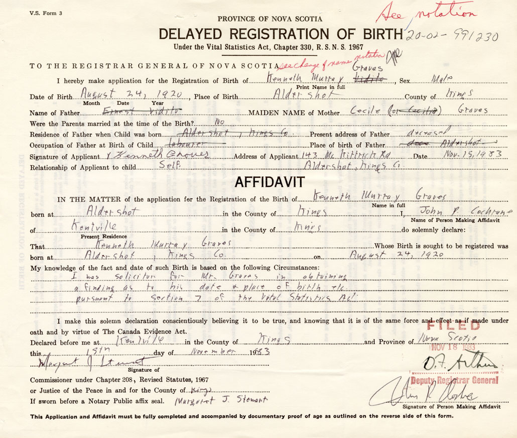 I was solicitor for Mr. Graves in obtaining a finding as to his date and place of birth, etc. Pursuent to Section 7 of the Vital Statistics Act