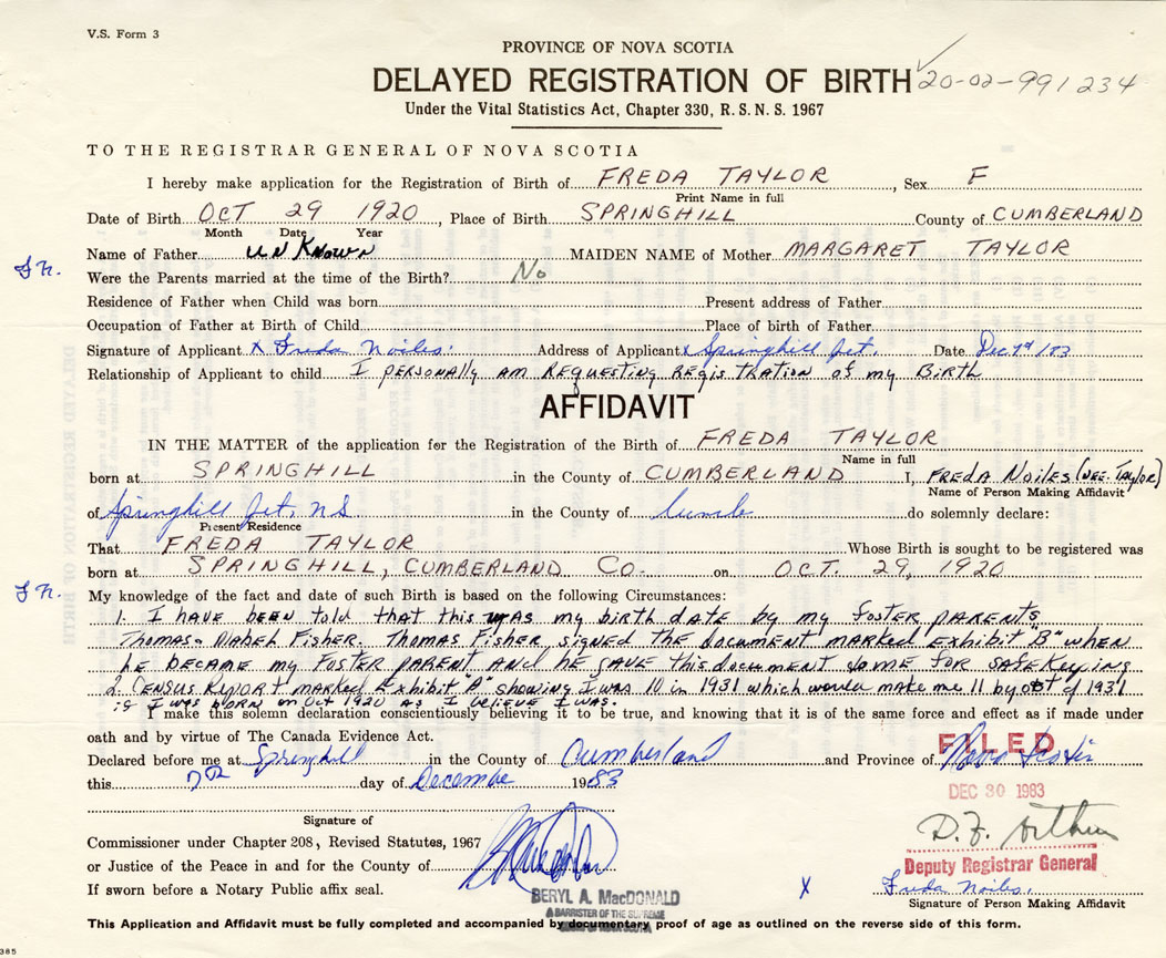 I hereby make application for the Registration of Birth of FredaTaylor Sex