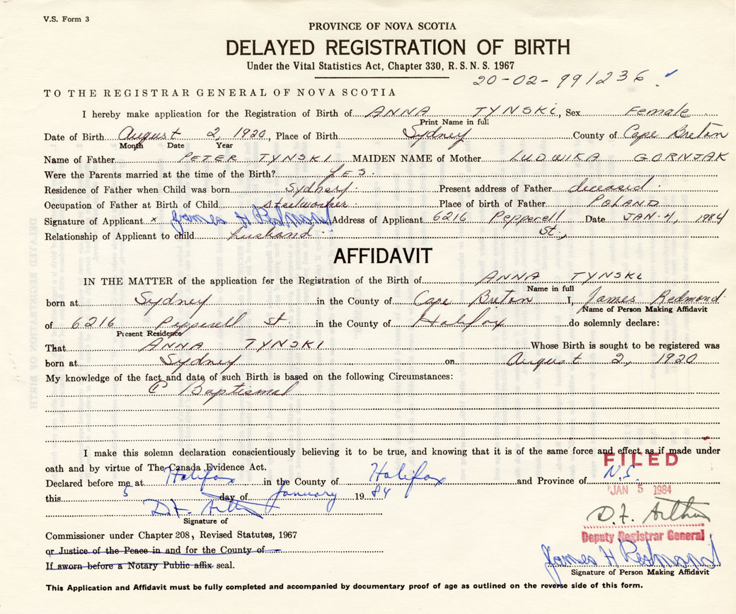 I hereby make application for the Registration of Birth of AnnaTynski Sex
