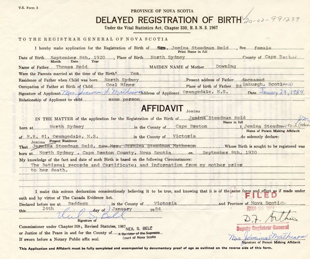 Date of Birth September 8, 1920 Place of Birth North SydneyCounty of Cape Breton