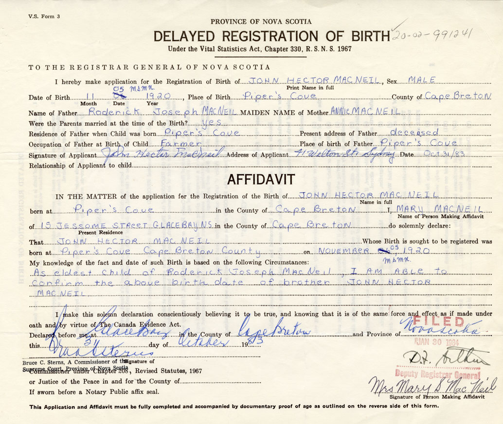 As the eldest child of Roderick Joseph MacNeil, I am able to confirm the above birthdate of brother, John Hector MacNeil. (Affidavit made by Mary MacNeil)
