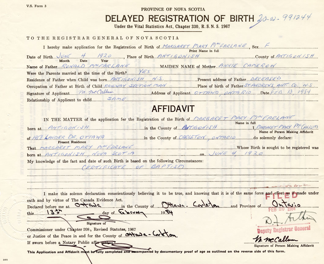 Date of Birth June 4, 1920 Place of Birth AntigonishCounty of Antigonish