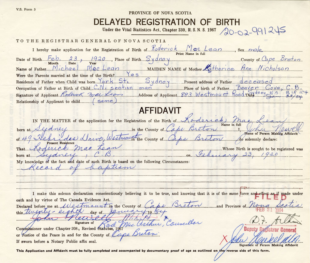 Date of Birth February 23, 1920 Place of Birth SydneyCounty of Cape Breton
