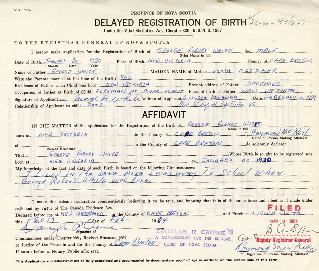 I lived in the same area. I was going to school when George Robert White was born. (Affidavit made by Raymond MacNeil)