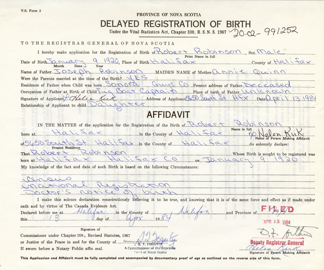 I hereby make application for the Registration of Birth of RobertRobinson Sex Male