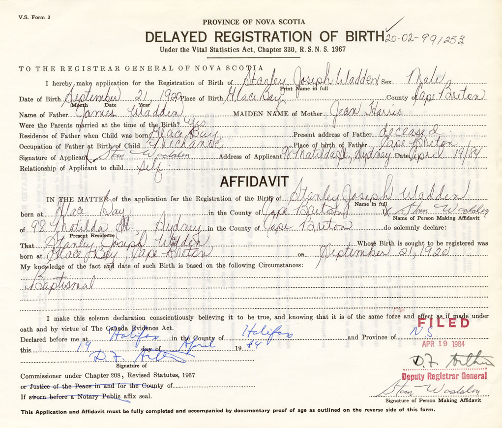 I hereby make application for the Registration of Birth of Stanley JosephWadden Sex Male