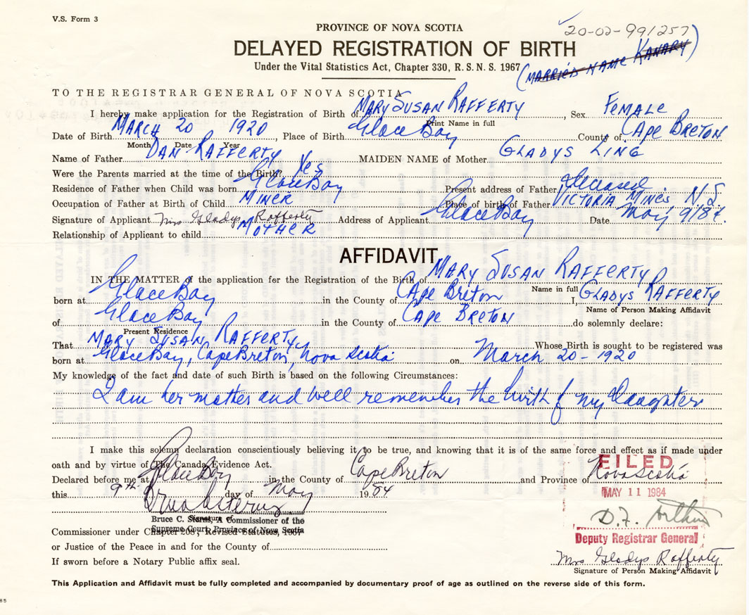 Date of Birth March 20, 1920 Place of Birth Glace BayCounty of Cape Breton