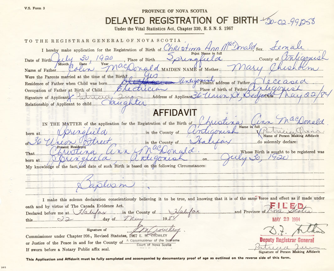 IN THE MATTER of the application for the Registration of the Birth of Christina AnnMacDonald
