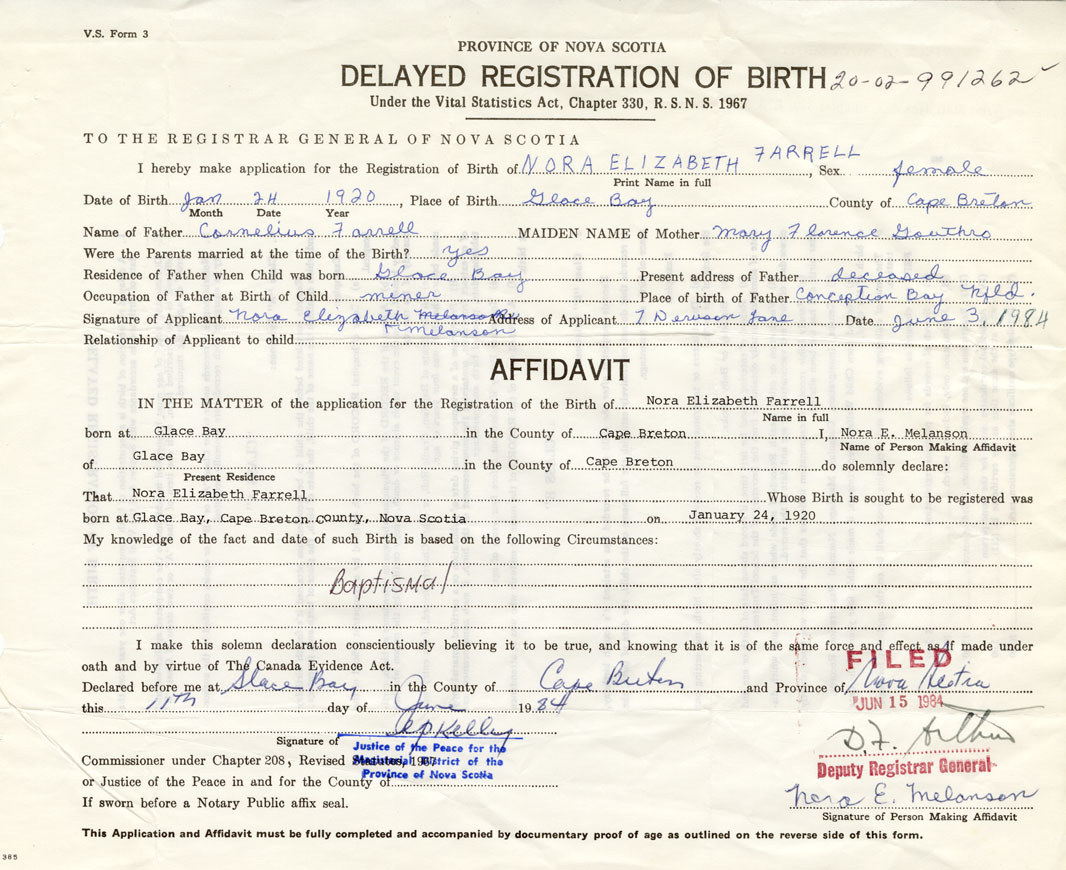 Signature of Applicant Nora Elizabeth Melanson Address of Applicant 7 Dawson Lane, Glace Bay Date 3 June 1984