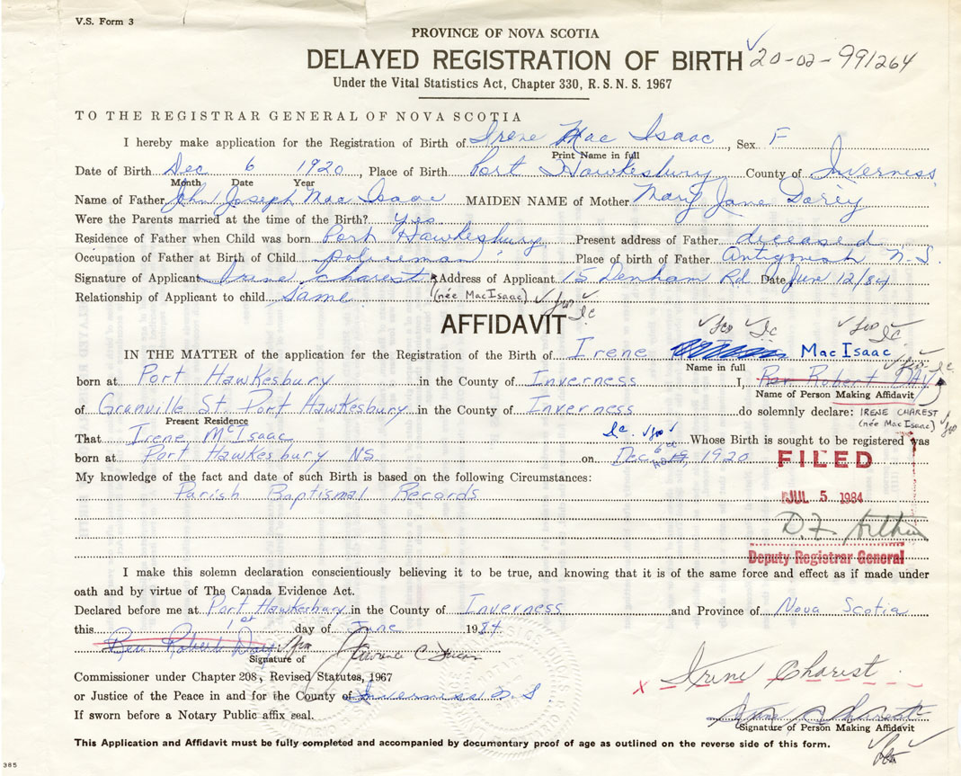 Date of Birth December 6, 1920 Place of Birth Port HawkesburyCounty of Inverness