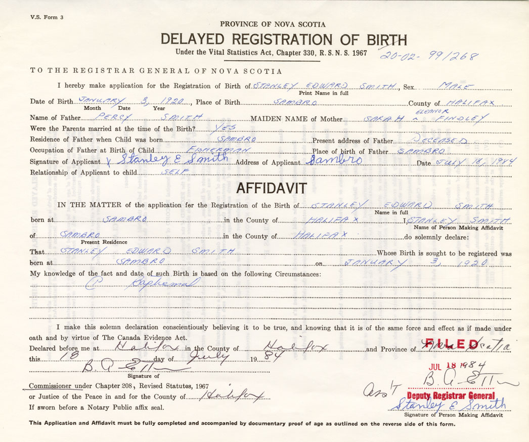 Date of Birth January 3, 1920 Place of Birth SambroCounty of Halifax