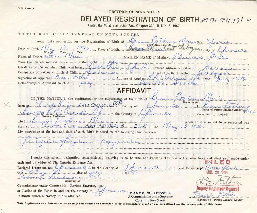 Date of Birth May 13, 1920 Place of Birth East ChebogueCounty of Yarmouth