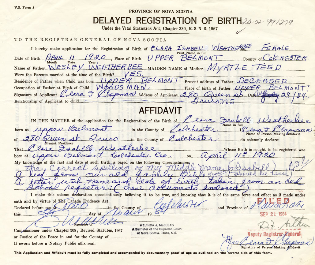 IN THE MATTER of the application for the Registration of the Birth of Clara IsabellWeatherbee