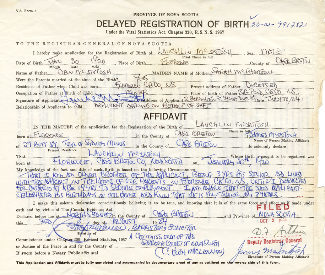 That I am an older brother of the applicant, being three years his senior and lived with the applicant in the home of our parents in Florence, Cape Breton County until I departed for Ontario at age 19yrs to secure employment. I am aware that the said applicant celebrated his birthdays in our home and know that he is my junior by 3 years. - James McIntosh