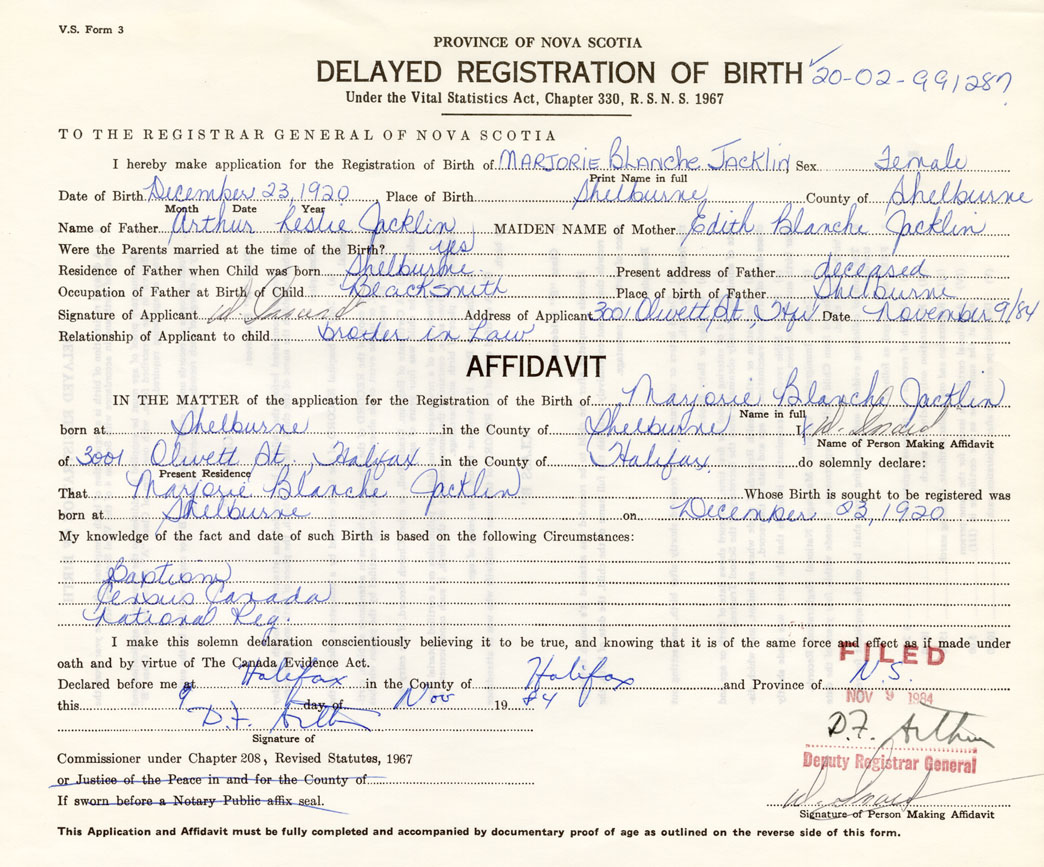 Date of Birth December 23, 1920 Place of Birth ShelburneCounty of Shelburne